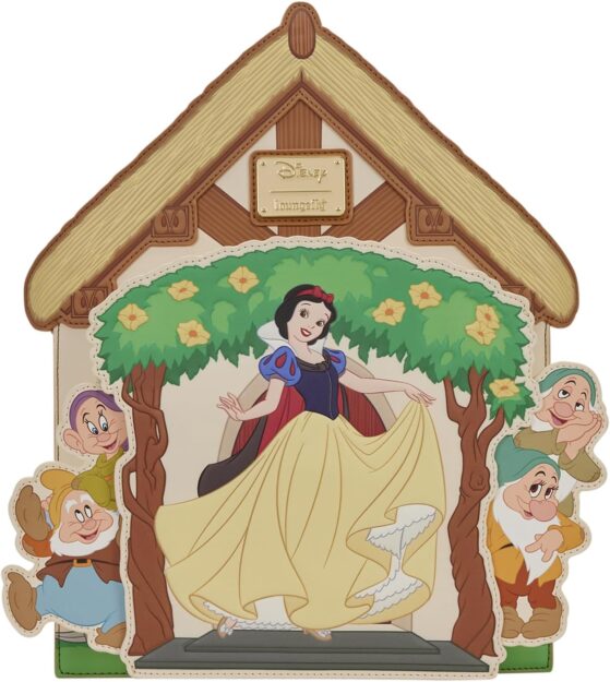 This Snow White Cottage Mini Backpack is in the shape of the dwarfs’ cottage with Snow White standing outside the front door. Appliques of Dopey, Happy, Bashful, and Sleepy can be pulled out to stand beside her, with Grumpy, Doc, and Sneezy are on the side pockets!