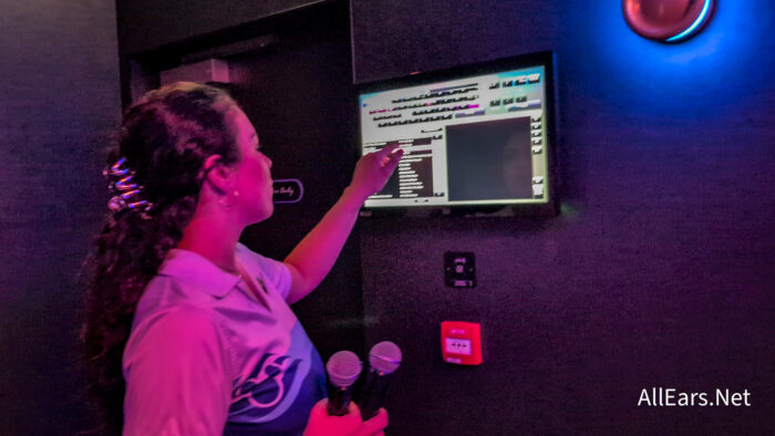 The room is (supposedly) soundproof, although Quincy and I have our doubts about that one. A Cast Member showed us inside and taught us how to use the touchscreen pad on the wall to choose our songs and create a queue. It has thousands of songs for us to sing, including Disney songs, Broadway hits, Pop songs, and more.