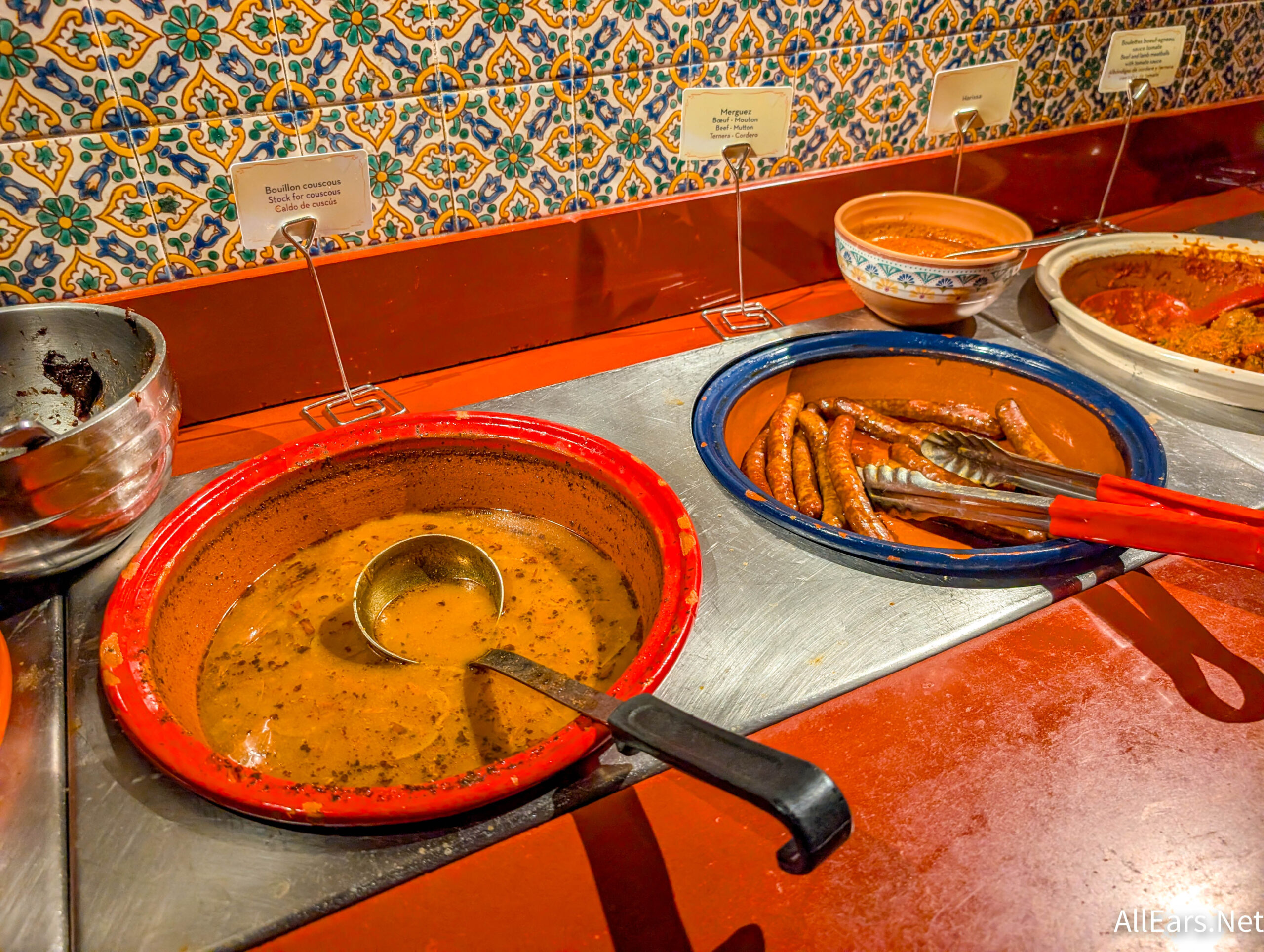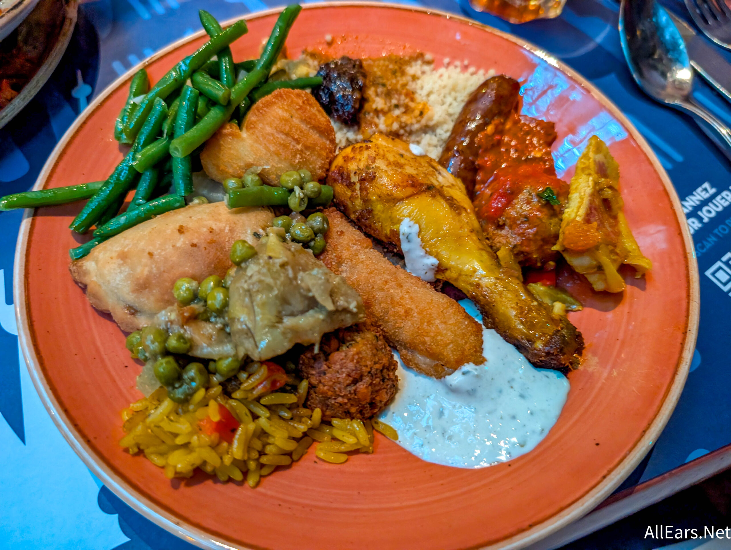 Agrabah Cafe immediately blew us away with its theming. It’s an indoor-outdoor market filled with tapestries, Turkish lanterns, stained glass, and murals. We came for the buffet counter, but there’s even an Aladdin-themed store inside the restaurant!