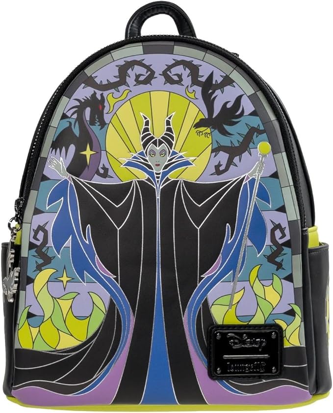 This Maleficent Stained Glass Mini Backpack features Maleficent in a stunning stained glass design surrounded by a dragon, a crow, thorns, and green flames. It’s crafted from faux leather with metallic and printed details.