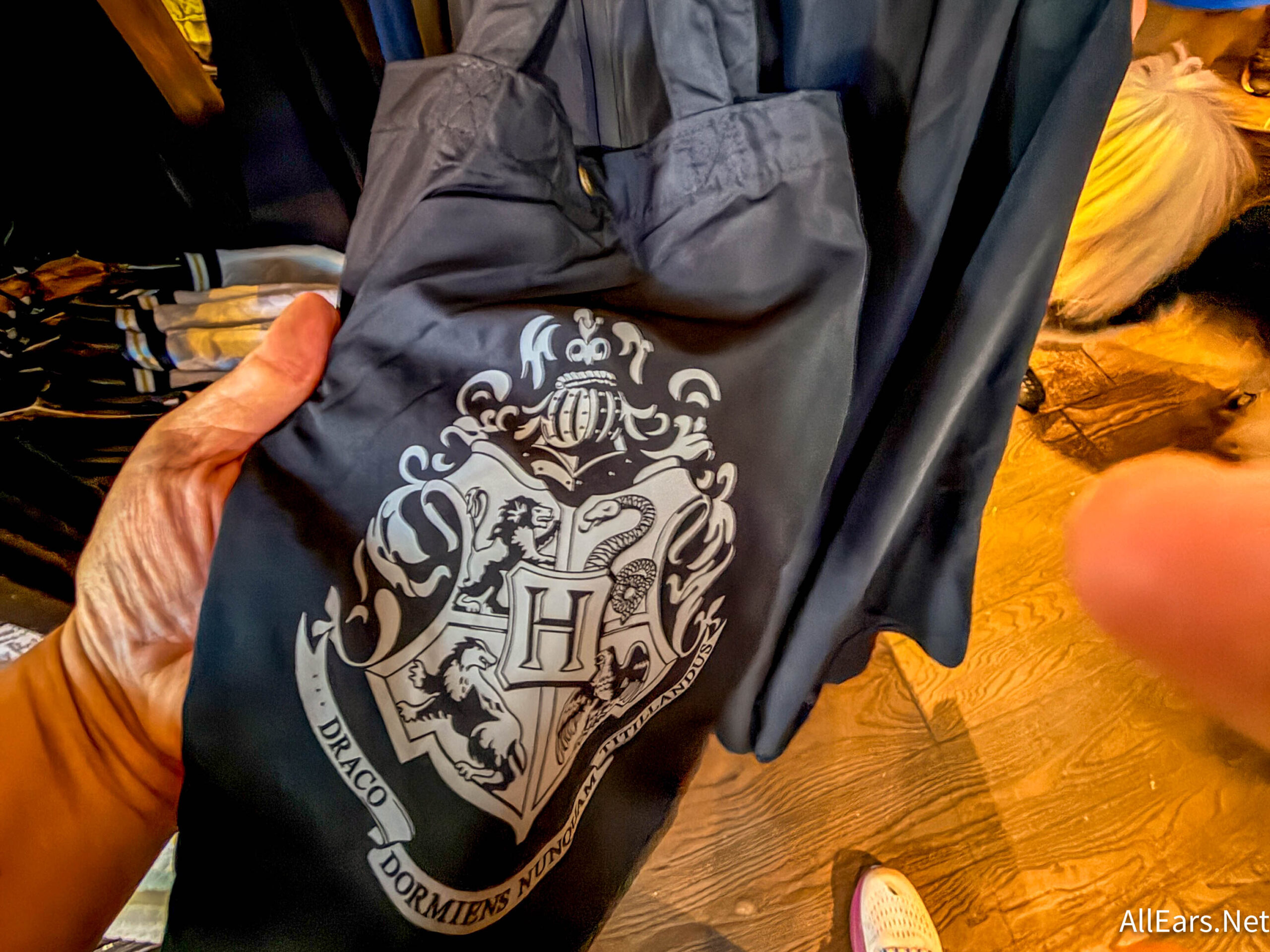 The back has a massive white Howarts logo. There’s also an attached hood with adjustable strings to secure it in the wind. It’s also super lightweight – this isn’t as heavy as the standard Hogwarts robes, and we could wear this any day in the Florida heat, rain or shine!