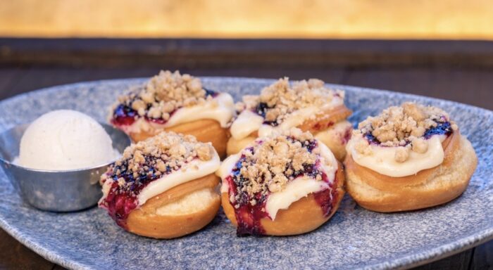 Next up coming to Lamplight Lounge at Disney California Adventure is new Lemon Blueberry Cobbler Donuts! These mini donuts will be dipped in cream cheese frosting with a lemon-blueberry compote and streusel on top.