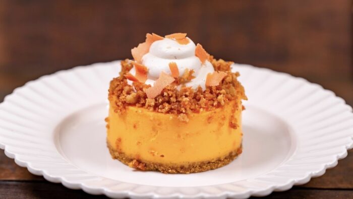 First up, an all new treat is coming to the fan-favorite Jolly Holiday Bakery Cafe at Disneyland. It is an Orange Cream Cheesecake, topped with vanilla Chantilly and orange crunch, and it looks so delicious!