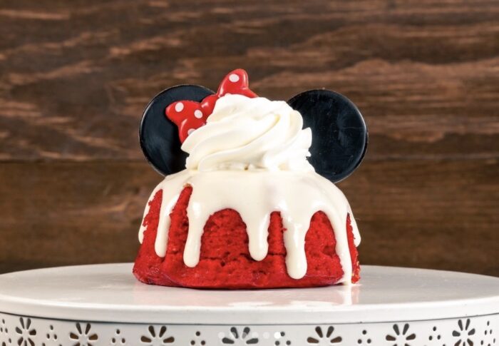 Finally, we are heading back over to Disneyland Park for this final dessert at Plaza Inn. This last item highlighted is a Strawberry Minnie Cake. This bundt cake is filled with a mix of strawberry jam and fresh strawberries, is topped with a sweetened condensed milk glaze and a white chocolate mousse, and it’s in the shape of Minnie Mouse with her ears and bow topping the cake!