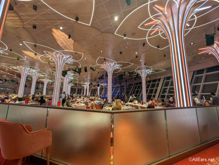 The seating is standard tables and chairs. The dining room is gorgeous and really feels larger than life. We have to say that this might be the most impressive of the rotational dining restaurants on the ship.