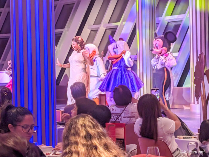 Now, the characters do walk around the room and briefly wave to diners, but this isn’t like a classic character dining experience where they stop for a full meet-and-greet situation with photos.