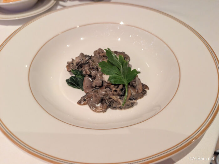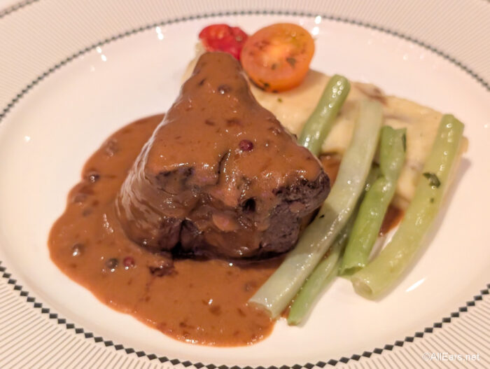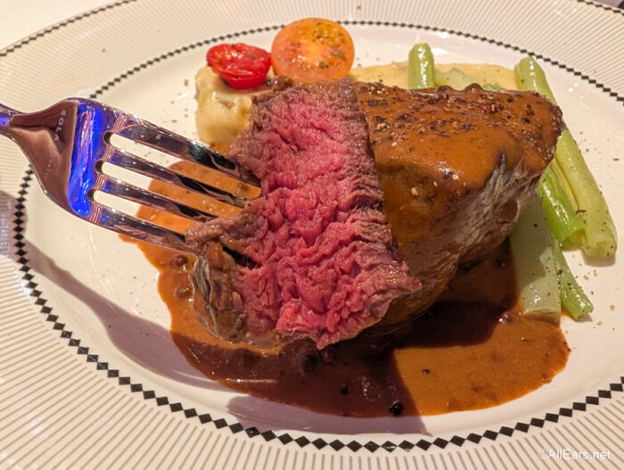 This is one of the best steaks we’ve ever had on a Disney Cruise ship. We requested medium rare, and it was cooked perfectly with a nice char on the outside. The creamy peppercorn sauce added a lovely tangy flavor. The veggies were also cooked well. Seriously, we could have eaten two of these.
