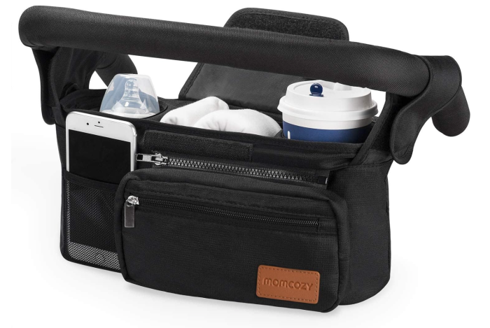 This has two insulated cup holders, a pocket for your phone, a zipper pocket, and a middle compartment for essentials. You can also remove the entire organizer from the stroller and wear it over your shoulder using the included straps.
