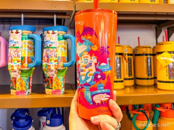 In Hollywood Studios, you can grab this Starbucks tumbler for $54.99. We found them at Celebrity 5 & 10, but you can sometimes find them in other stores throughout the park. The front features Sorcerer Mickey!
