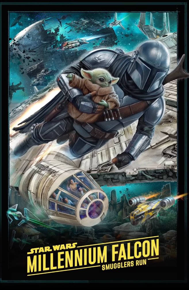 The new poster features artwork from The Mandalorian and Grogu in front of the Millennium Falcon. The Star Wars Millennium Falcon logo is below it.
