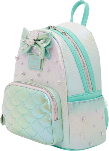 This mini backpack is inspired by Ariel from Disney’s The Little Mermaid. You’ll find purple-to-green iridescent material featuring fish scale details. The pearls appear on the front and side pockets. A 3D bow can be found at the top of the bag, featuring an enamel charm of a seashell with tulle and pearls.