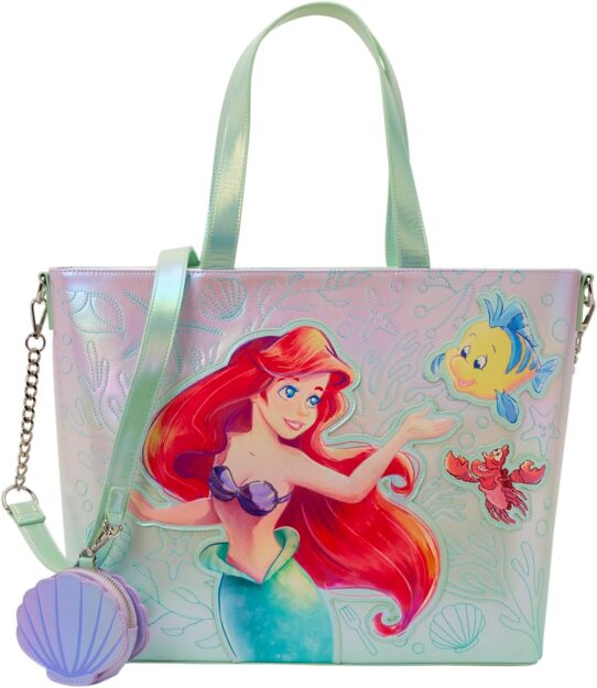 There’s also a BRAND NEW bag online that we know tons of moms will love — they’ll absolutely adore The Little Mermaid Ariel, Flounder, & Sebastian Loungefly Tote Bag!