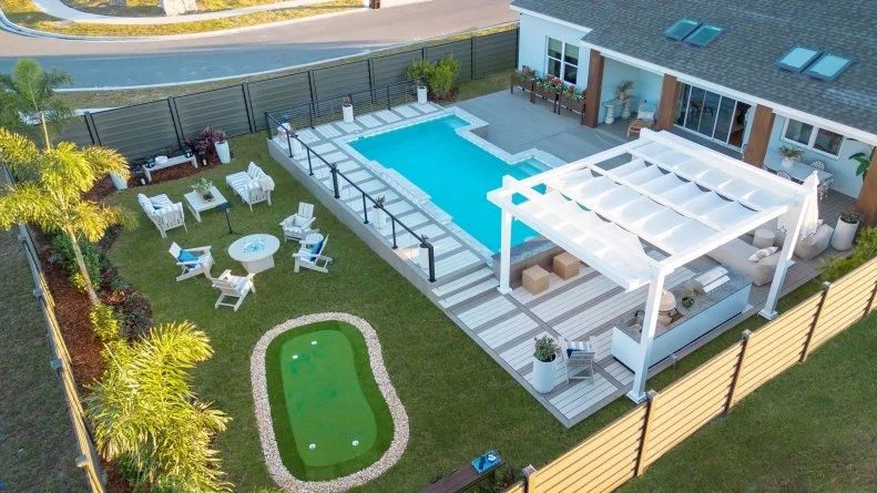 …to the backyard, this house is STUNNING! Hello, a swimming pool AND putting green?!