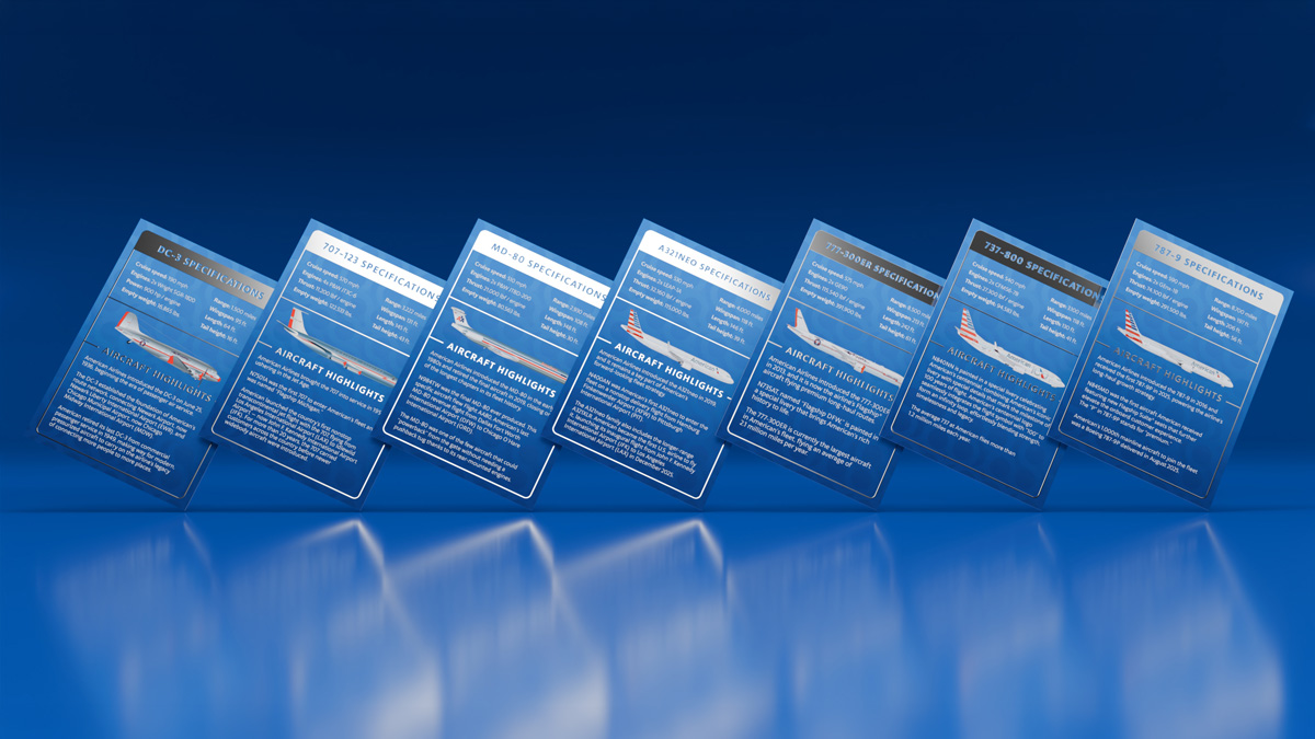 The trading card line-up will include showcases of four fleet types currently flown by American: the A321neo, 737-800, 777-300ER, and 787-9P. In addition, to commemorate the airline’s centennial anniversary, three special edition trading cards will be available of the DC-3, 707-123, and MD-80, representing three aircraft that were instrumental in shaping American’s history.