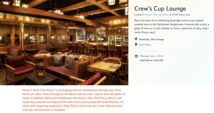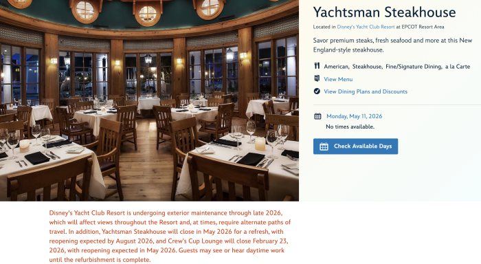 Yachtsman Steakhouse at Disney’s Yacht Club Resort is closing for refurbishment in May 2026 and is expected to reopen by August 2026.