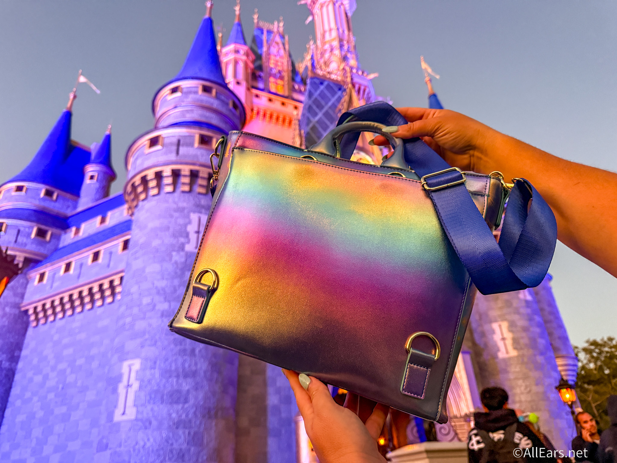 This Loungefly Fantasia Convertible Backpack & Tote is an irridescent blue on a slick canvas tote bag with multiple pockets inside and out. The front design features Sorcerer Mickey embroidered in gold against a crushed velvet blue backing. This bag is so pretty, and we got so many compliments on it! This bag was so roomy and could fit everything we needed and more – it’s a great option if the Loungefly Mini Backpacks are too small for you!