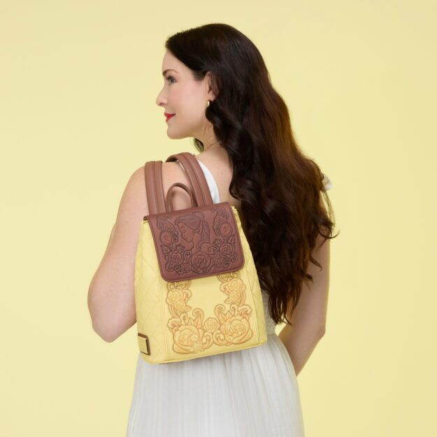 The quilted sides give it a structured, elevated look, while the yellow body and brown accents keep it clearly Beauty and the Beast without being overly literal about it. The top flap features Belle surrounded by florals, with more floral and character details at the base of the bag and on the back. It’s only available at Loungefly.com, making it a genuine exclusive worth bookmarking.