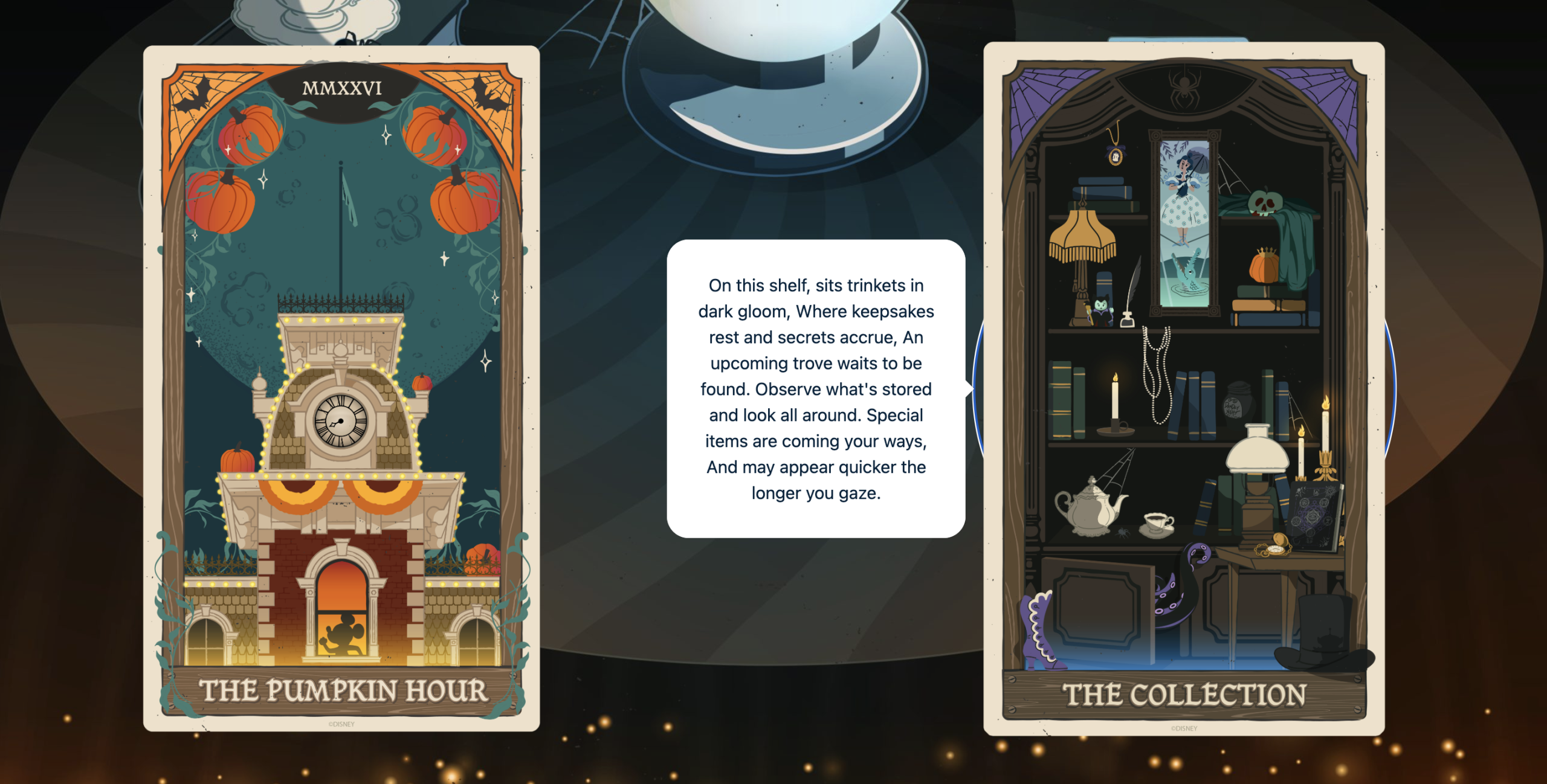 Disney then also revealed a SECOND card, this one with the hint, “On this shelf, sits trinkets in dark gloom, Where keepsakes rest and secrets accrue, An upcoming trove waits to be found. Observe what’s stored and look all around. Special items are coming your ways, And may appear quicker the longer you gaze.” When we look closely at this one, we can see hints to Haunted Mansion, Ursula, Maleficent, a green alien from Toy Story inside the black top hat, The Evil Queen, The Nightmare Before Christmas, and more!