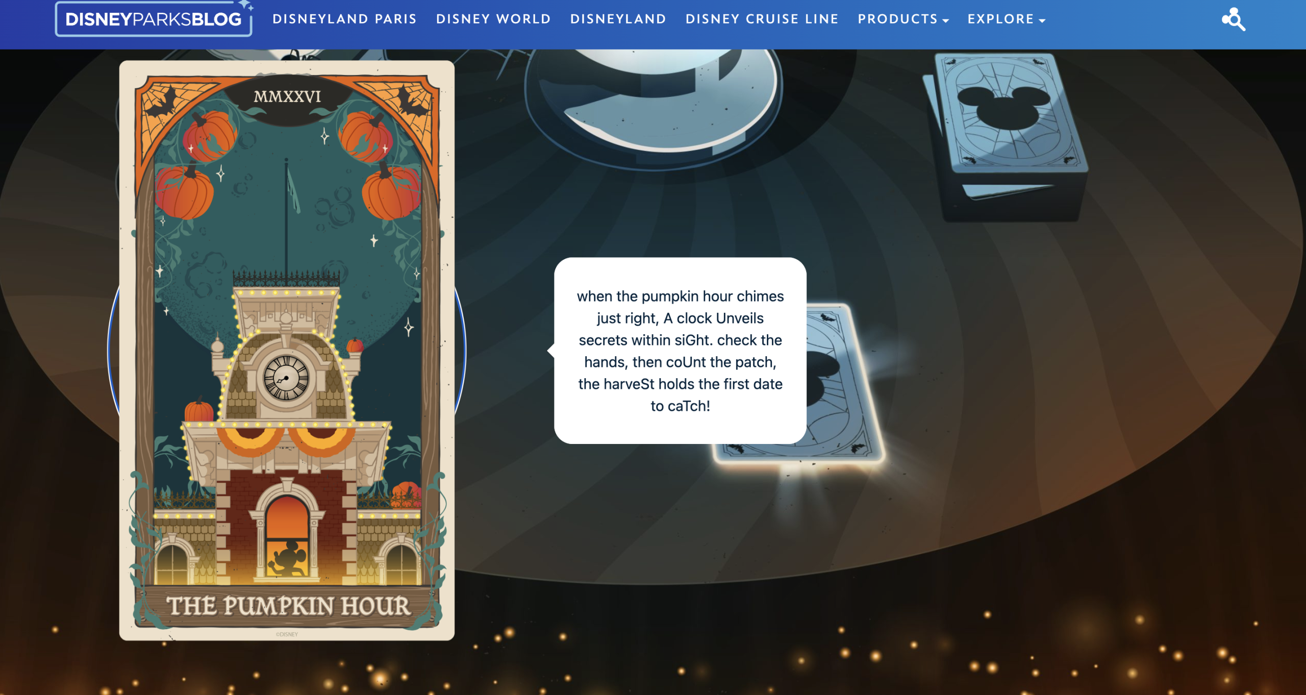 Disney released a fun clue to hint at some Halloween news that will be coming our way soon. The clue reads, “when the pumpkin hour chimes just right, A clock Unveils secrets within siGht, check the hands, then coUnt the patch, the harveSt holds the first date to caTch!” When you put all the capital words together, it spells out August!
