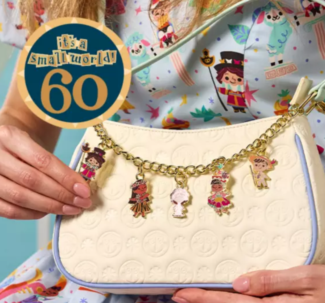 Also arriving on May 11th is the “it’s a small world” Disneyland Resort 60th Anniversary collection. The sneak peek shows a woman in a small world-themed dress, as well as a handbag with charms inspired by the animatronics on the ride. How cute!