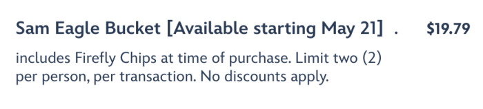 There will be a limit of two buckets per person, and it will cost $19.79. The bucket comes with Firefly Chips, which are Spicy Corn Chips topped with Chili, Cheese, and Jalapenos. How fun to have a bucket that’s not just a popcorn bucket!