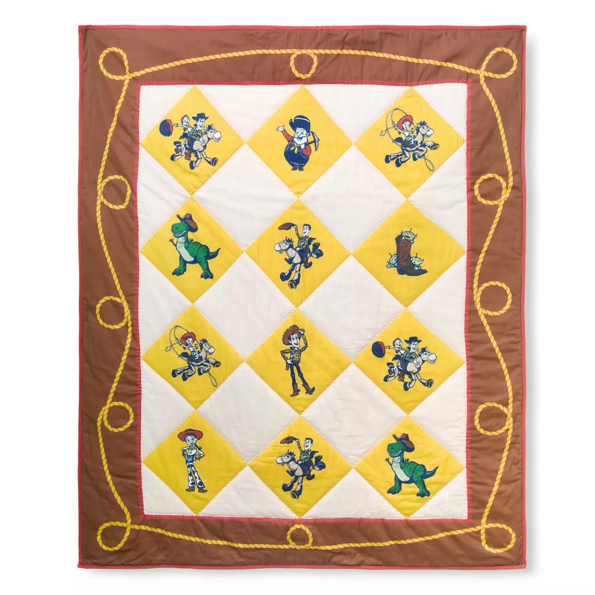 The brown edging features a coiled rope pattern. The backside of the blanket features the characters in different poses on an all-brown western background.