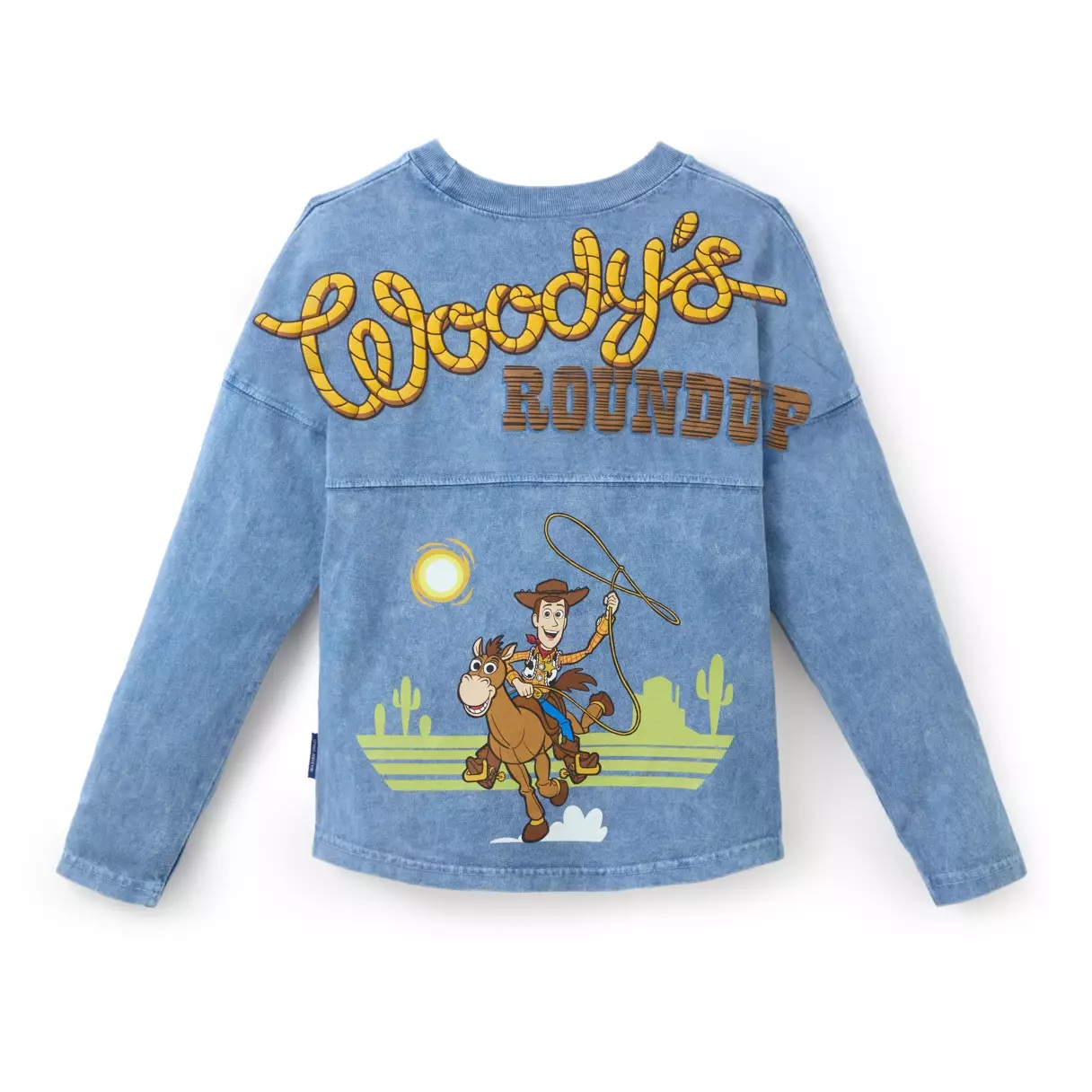 You little ones can rock this as the new sheriff in town, with a golden badge on the front, Woody and Bullseye, and “Woody’s Roundup” logo on the back. The spirit jersey has a faded denim look, giving it a more western feel.