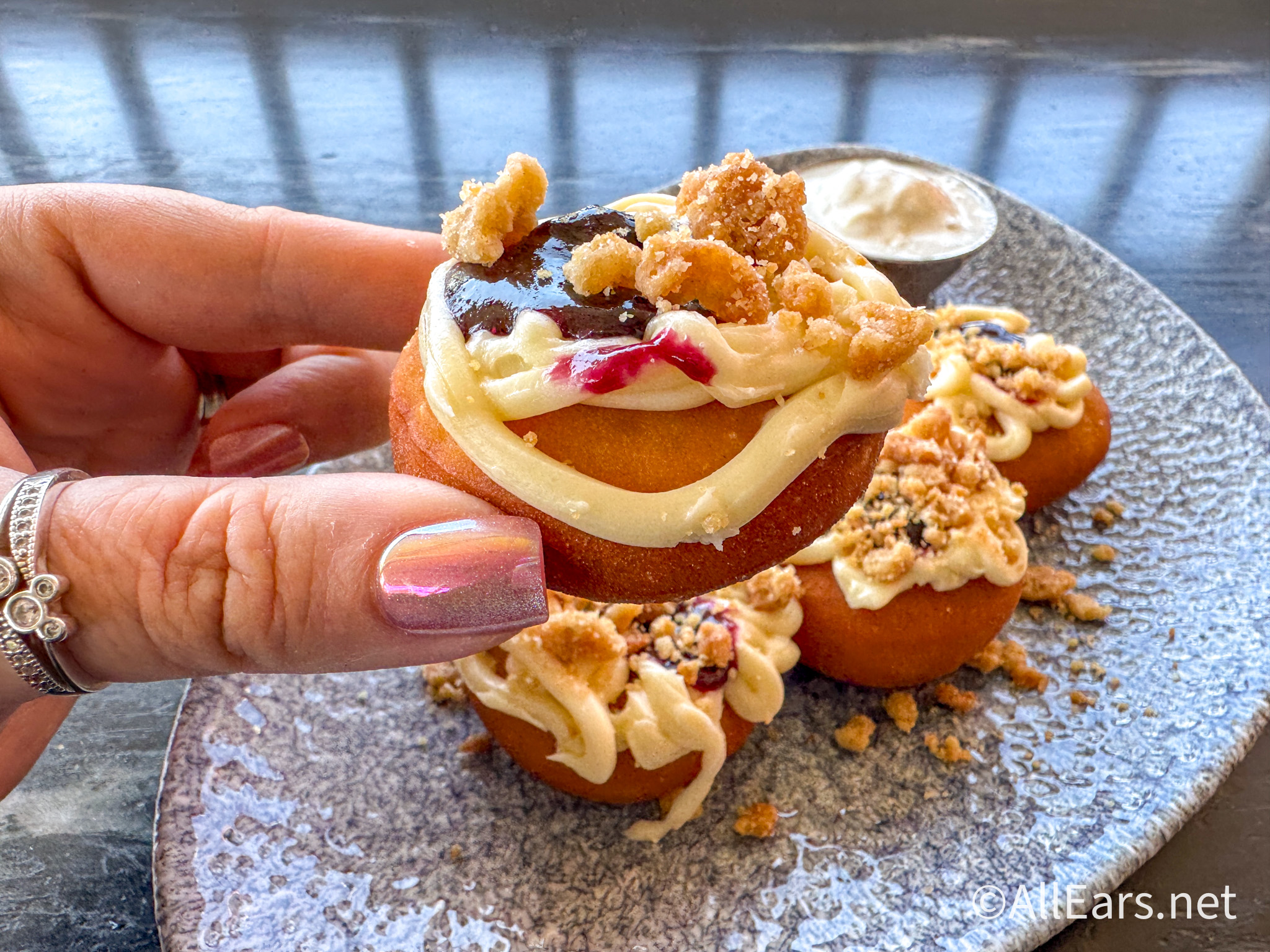 In Disney California Adventure, there’s a dining spot at the front of Pixar Pier called Lamplight Lounge. There, we grabbed two things, the first being the Lemon Blueberry Cobbler Donuts for $11.00.