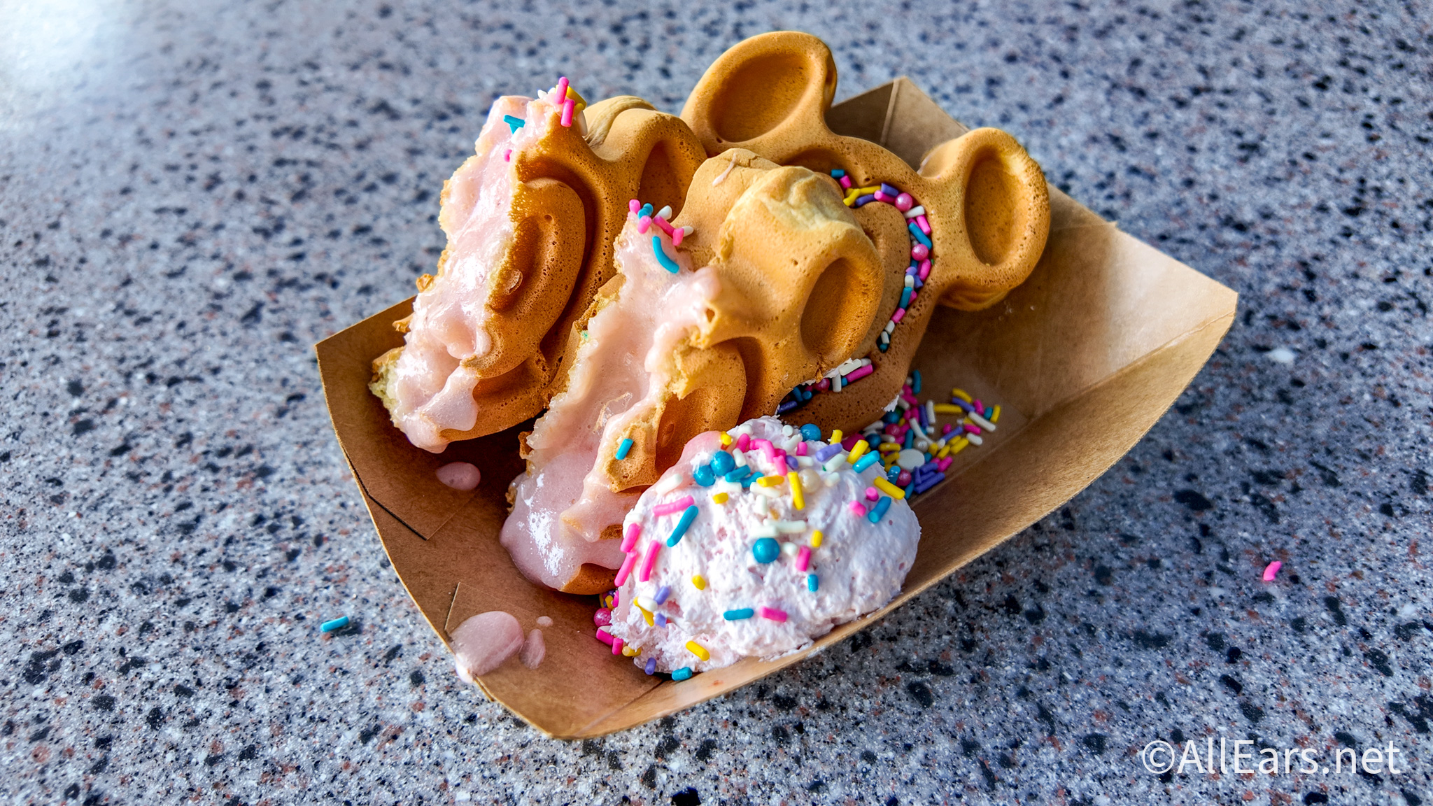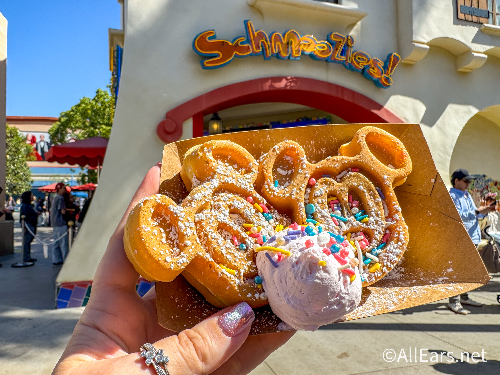 Our first stop is Schmoozies, which you’ll find at Hollywood Land in Disney California Adventure. We apologize for any craving pain you experience when we show the Mickey-Shaped Celebration Waffles we got for $10.99.