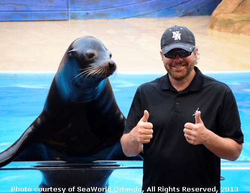 Posted onIn Orlando with his family for the holidays, country music superstar Toby Keith gives two thumbs up to Clyde the sea lion following the show at SeaWorld Orlando. He also bent down for an up-close Happy New Year flipper shake from the sleek and sassy sea lion.