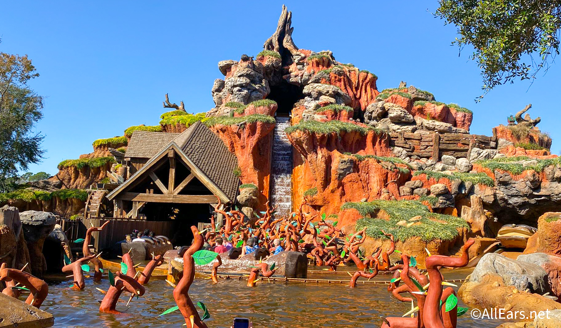 7. After your exciting ride through the mine and the forest, the train comes to a smooth stop just beyond the unload area. Look to your right for the best surprise of all! You'll see some familiar figures from the old Snow White's Scary Adventures attraction.